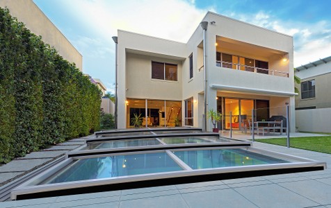 Um die einzelnen Teile der Überdachung sicher bewegen zu können, ist das System nur unter dem kleinsten Segment und im Parkbereich der Überdachung hinter dem Pool mit kurzen, unauffälligen Führungsschienen ausgestattet. Die Umgebung des Pools bleibt ungehindert. Die TERRA PRIME Überdachung ist flach und passt daher zum architektonisch sauberen Stil Ihres Hauses und macht sich sehr gut in kleineren Gärten, in denen die Aussicht im Vordergrund steht.