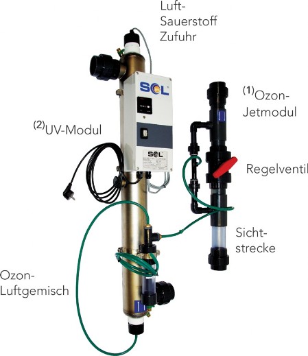 Das Ozon wird über ein Jet-Modul dem Schwimmbadwasser zugeführt und gemeinsam durch die UV-Anlagen gefördert.